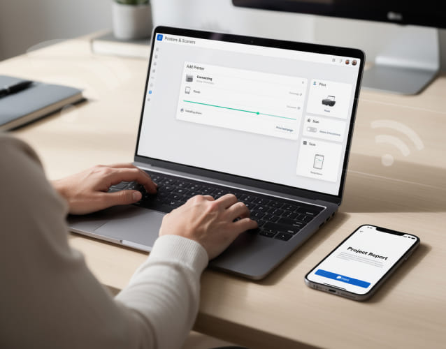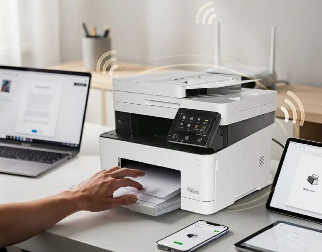 The printer supports Wi-Fi, Wi-Fi Direct, AirPrint, Mopria, and PRINT Business, allowing easy printing from laptops, smartphones, and tablets, which makes it ideal for shared teams, modern offices, and flexible cable-free workspaces